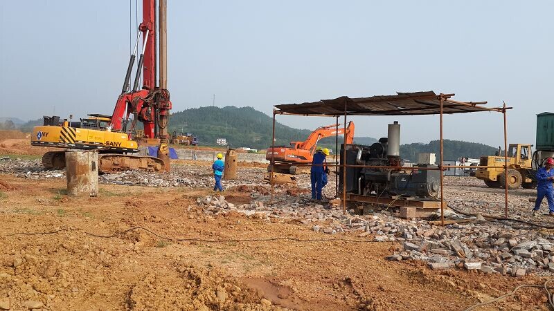 施工內(nèi)容及工程量:灌注樁鋼筋籠制作、運(yùn)輸及安放,鉆孔樁成孔、商品砼采買、砼灌注。旋挖鉆孔灌注樁樁基工程共完成1244根,樁徑800mm,樁身混凝土強(qiáng)度等級為C30,完成總米數(shù)23458.18米,設(shè)計混凝土方量11791.37方,實際灌注混凝土15624m³,后壓漿共使用900噸復(fù)合硅酸鹽水泥,加工鋼筋791.56t。