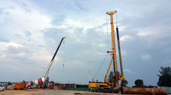 文萊PMB跨海大橋首根試樁鉆孔直徑1.5m,鉆孔深度68.6m,灌注混凝土120方。試樁內(nèi)裝有“荷載箱”兩組,鋼筋應(yīng)力計(jì)52組。通過技術(shù)攻關(guān),首根試樁的鉆孔垂直度、泥漿參數(shù)、沉渣厚度等指標(biāo)均滿足歐標(biāo)要求,順利通過總包、監(jiān)理驗(yàn)收。尤其是混凝土灌注施工,有了鉆孔質(zhì)量的保證,混凝土灌注導(dǎo)管自由的在布設(shè)有兩組關(guān)卡的“荷載箱”內(nèi)安放、提拔,獲得了總包方和監(jiān)理方稱贊,監(jiān)理工程師向我們豎起了大拇指。我們以一流的管理、先進(jìn)的設(shè)備、精湛的技術(shù),進(jìn)一步擦亮了“河北建勘”品牌。