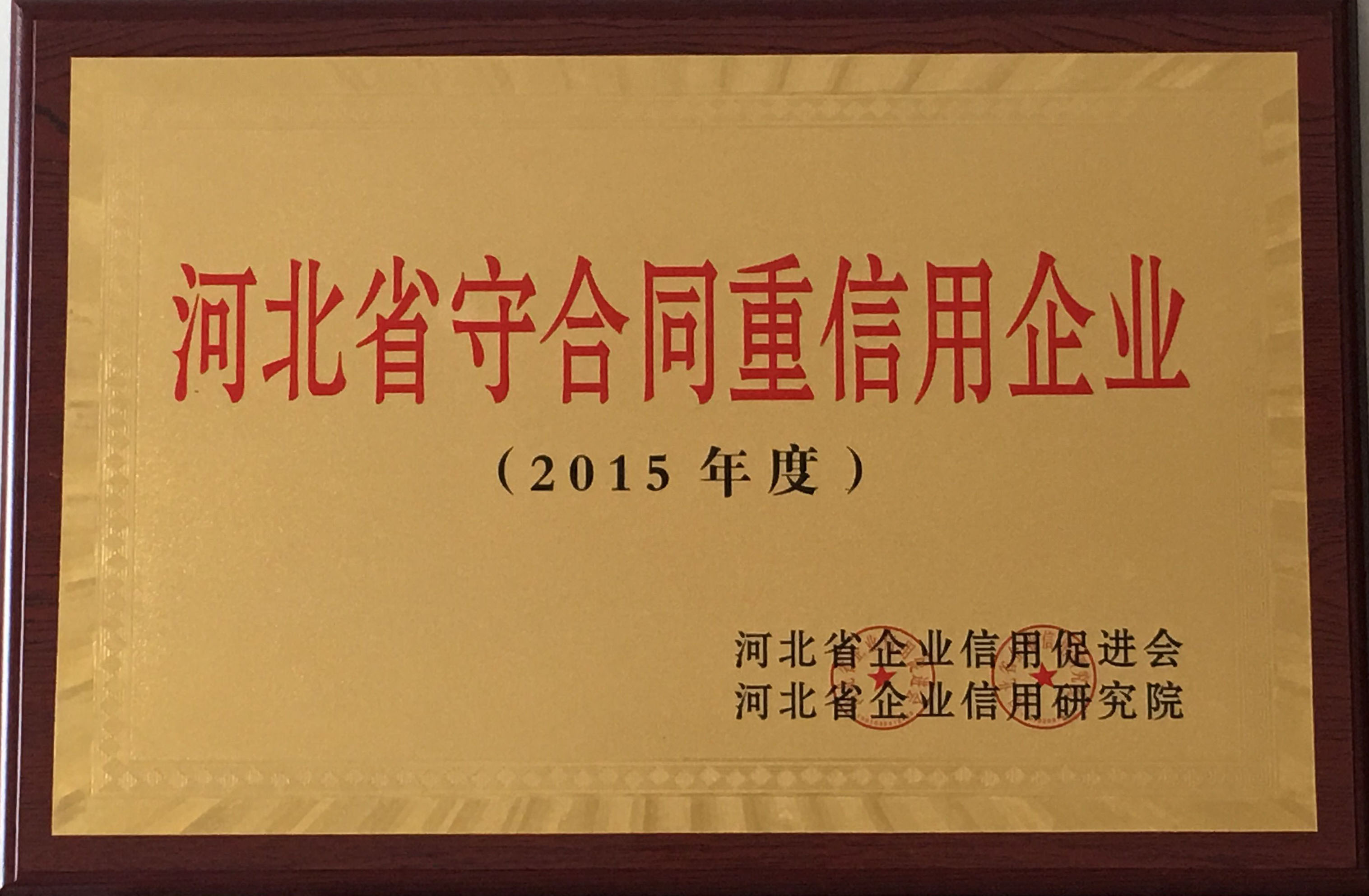 根據(jù)河北省文明辦、河北省企業(yè)信用促進會印發(fā)的《“善行河北·誠信企業(yè)”主題實踐活動實施方案》,河北省企業(yè)信用促進會、河北省企業(yè)信用研究院對“守合同重信用”企業(yè)進行認定,我公司被授予2015年度河北省守合同重信用企業(yè)稱號。
