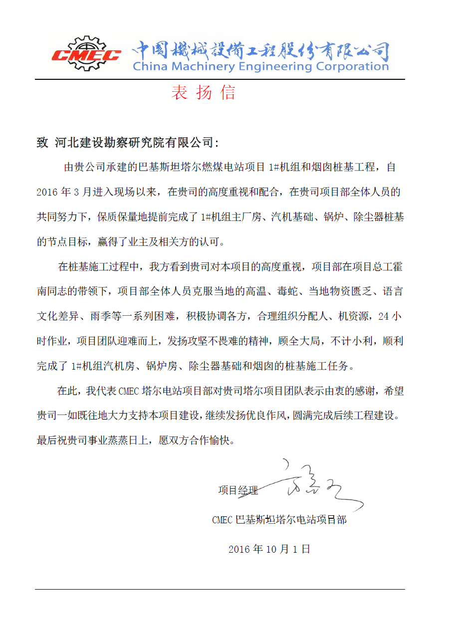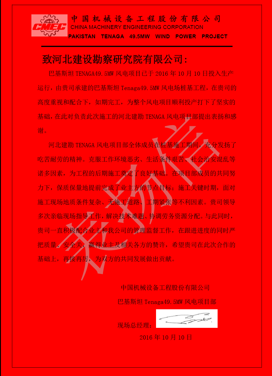 由我公司承建的巴基斯坦塔爾燃煤電站項目1#機組和煙囪樁基工程和巴基斯坦Tenaga49.5MW風(fēng)電項目,項目部全體人員在項目總工霍南的帶領(lǐng)下,克服工作環(huán)境惡劣、生活條件艱苦等一系列困難,積極協(xié)調(diào)各方,合理組織分配資源,順利完成階段施工任務(wù)。近日,總包方中國機械設(shè)備工程股份有限公司(CMEC)向我公司發(fā)來感謝信,對我公司兩個項目部團(tuán)隊表示由衷的感謝,并希望我們繼續(xù)發(fā)揚優(yōu)良作風(fēng),圓滿完成后續(xù)工程建設(shè)。