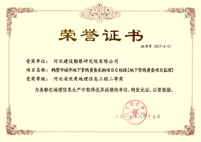近日,經河北省測繪學會評選,由我公司承擔的鶴壁市城市地下管線普查采購項目C標段(地下管線普查項目監(jiān)理)榮獲河北省優(yōu)秀地理信息工程二等獎。