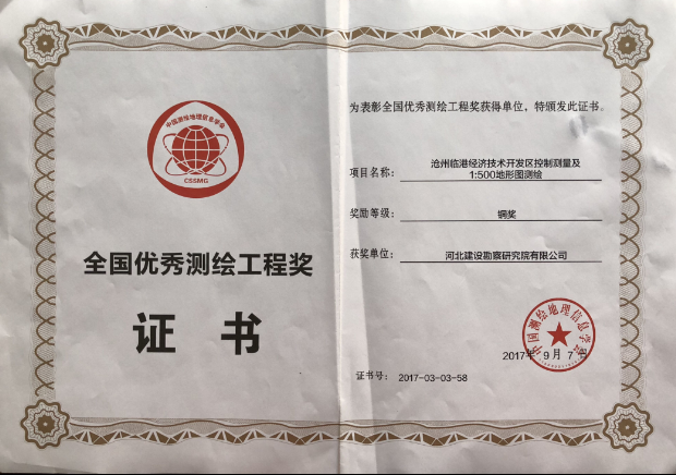 2017年9月7日,由我公司完成的滄州臨港經(jīng)濟(jì)技術(shù)開發(fā)區(qū)控制測(cè)量及1:500地形圖測(cè)繪項(xiàng)目,被中國(guó)測(cè)繪地理信息學(xué)會(huì)授予全國(guó)優(yōu)秀測(cè)繪工程銅獎(jiǎng)。
