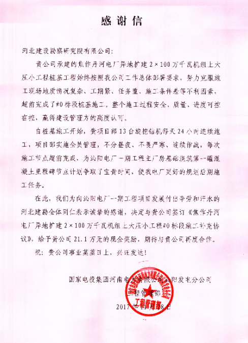 我公司承建的焦作丹河電廠異地擴建2×100萬千瓦機組上大壓小工程樁基工程,始終按照業(yè)主工作總體部署要求,努力克服施工現(xiàn)場地質(zhì)情況復雜、工期緊、任務(wù)重、施工條件差等不利因素,超前完成了#0標段樁基施工,整個施工過程安全、質(zhì)量、進度可控在控,贏得了建設(shè)管理方的高度認可。11月28日,國家電投集團河南電力有限公司沁陽發(fā)電分公司工程管理部發(fā)來感謝信,對我公司項目部員工表示感謝,并期待與我公司的再度合作。