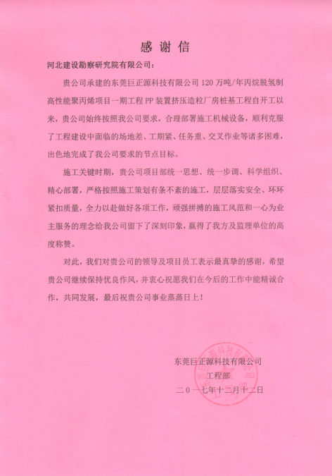 我公司承建的東莞巨正源科技有限公司120萬(wàn)噸/年丙烷脫氫制高性能聚丙烯項(xiàng)目一期工程—PP裝置擠壓造粒廠房、PDH裝置反應(yīng)框架鉆孔灌注樁基礎(chǔ)工程,克服了施工過(guò)程中褚多困難,按照合同節(jié)點(diǎn)圓滿完成施工任務(wù)。東莞巨正源科技有限公司近日發(fā)來(lái)感謝信,對(duì)公司領(lǐng)導(dǎo)及項(xiàng)目員工表示最真摯的感謝。