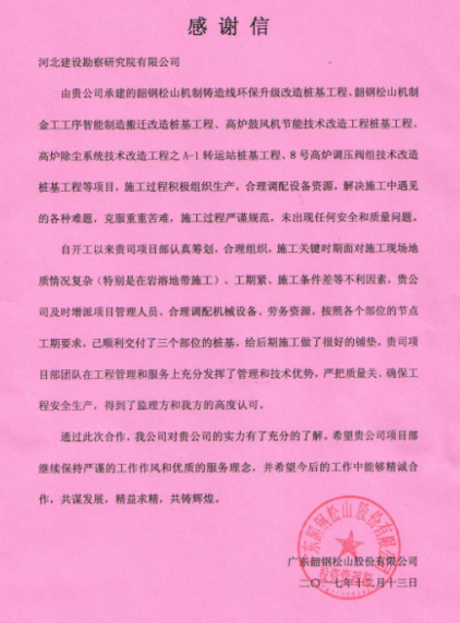 由我公司施工的韶鋼煤氣高效綜合循環(huán)利用改建工程,克服了施工過程中的各項(xiàng)難題,已順利交付三個部位樁基,得到了廣東韶鋼松山股份有限公司的高度認(rèn)可,特向公司發(fā)來感謝信。