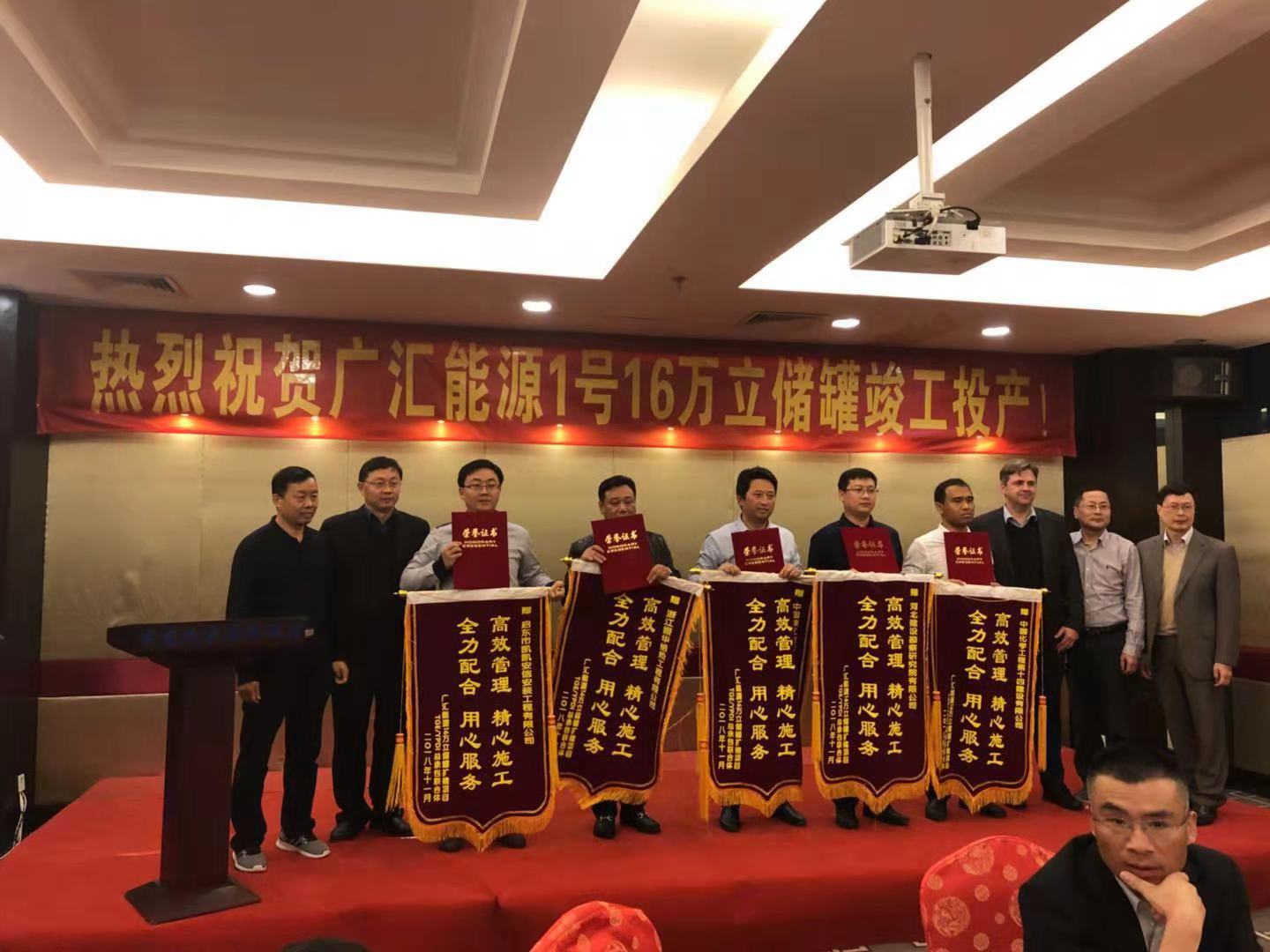 2018年11月21日,廣匯能源1號(hào)16萬m³儲(chǔ)罐項(xiàng)目順利投產(chǎn),并創(chuàng)造了LNG行業(yè)新的記錄。在竣工投產(chǎn)慶功會(huì)上,廣匯能源總經(jīng)理和TGE總經(jīng)理對(duì)我公司在項(xiàng)目中的突出貢獻(xiàn)給予了高度贊揚(yáng),并授予錦旗和“優(yōu)秀分包商”證書,同時(shí)也對(duì)我公司在2號(hào)16萬立方儲(chǔ)罐施工過程中的優(yōu)秀表現(xiàn)提出了表揚(yáng),并期望我公司更多的參與廣匯能源的項(xiàng)目建設(shè)。
