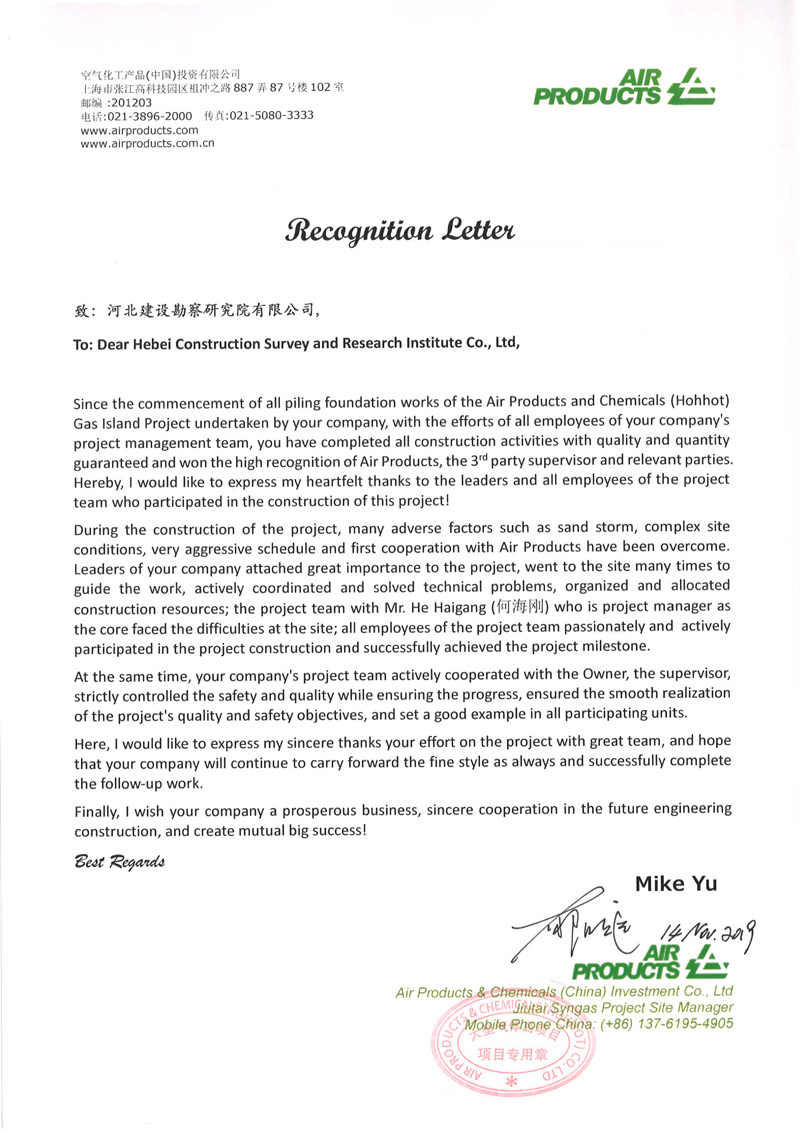 我公司承建的美國AP公司大型氣體島項目,安全、優(yōu)質完成了全部地基處理任務。施工期間克服天氣寒冷、工期緊等因素,投入旋挖鉆機8臺套,一個月完成灌注樁20000立方,取得了業(yè)主的一致好評。