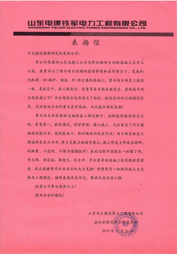 近日,由我公司承建的孟加拉艾薩拉姆項(xiàng)目樁基工程收到總包單位山東電建三公司的表揚(yáng)信,經(jīng)過項(xiàng)目部全體員工的辛勤付出,得到總包單位的高度認(rèn)可,為后續(xù)雙方合作奠定良好基礎(chǔ)。這充分彰顯了河北建勘人的風(fēng)采,充分體現(xiàn)了河北建勘人的鐵軍精神,充分展示了河北建勘的戰(zhàn)斗力和實(shí)力,為我司業(yè)務(wù)在孟加拉更好更快發(fā)展提供了保證。項(xiàng)目部全體員工一定會(huì)珍惜榮譽(yù),珍視公司良好發(fā)展平臺(tái),再接再厲,圓滿完成后續(xù)施工任務(wù)!