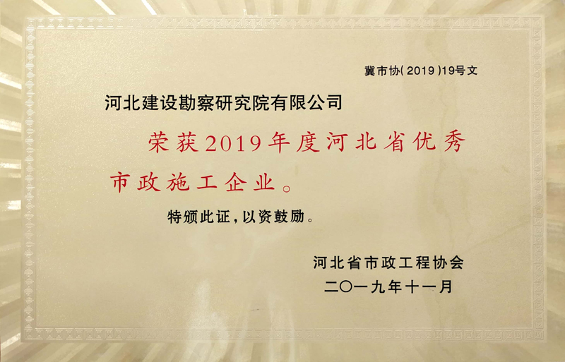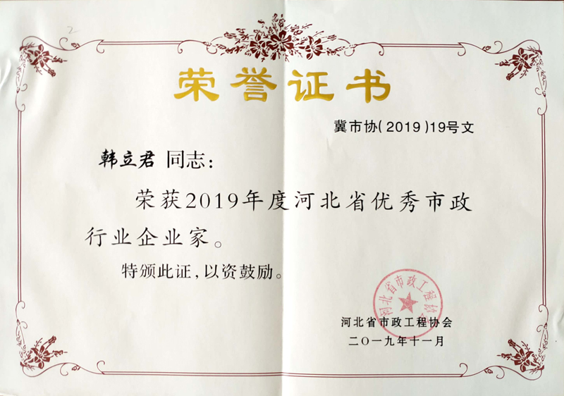 近日公司被河北省市政工程協(xié)會(huì)評(píng)為“2019年度河北省優(yōu)秀市政施工企業(yè)”;公司董事長(zhǎng)韓立君同志獲評(píng)“2019年度河北省優(yōu)秀市政行業(yè)企業(yè)家”。