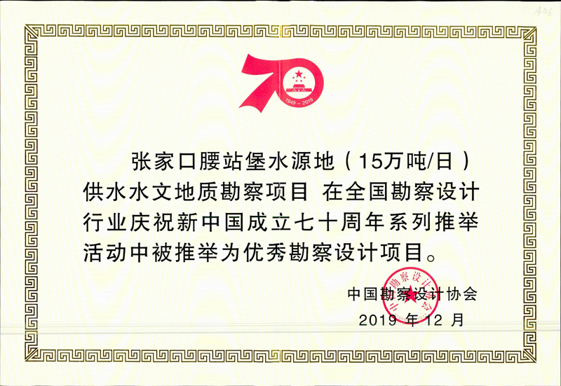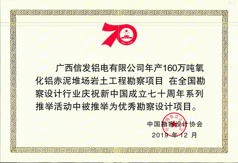 其中,我公司榮獲“優(yōu)秀勘察設(shè)計企業(yè)”榮譽稱號,董事長韓立君榮獲“優(yōu)秀企業(yè)家”稱號,總工程師聶慶科榮獲“科技創(chuàng)新帶頭人”榮譽稱號。我公司完成的張家口腰站堡水源地(15萬噸/日)供水水文地質(zhì)勘察項目、廣西信發(fā)鋁電有限公司年產(chǎn)160萬噸氧化鋁赤泥堆場巖土工程勘察項目被推舉為優(yōu)秀勘察設(shè)計項目。