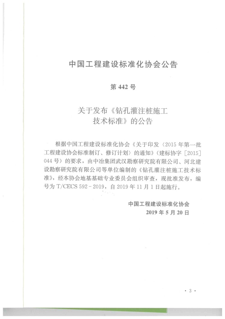 近日,我公司主編的中國工程建設(shè)標(biāo)準(zhǔn)化協(xié)會(huì)標(biāo)準(zhǔn)《鉆孔灌注樁施工技術(shù)標(biāo)準(zhǔn)》(T/CECS 592-2019)由中國建筑工業(yè)出版社正式出版發(fā)行,于2019年11月1日起實(shí)施。