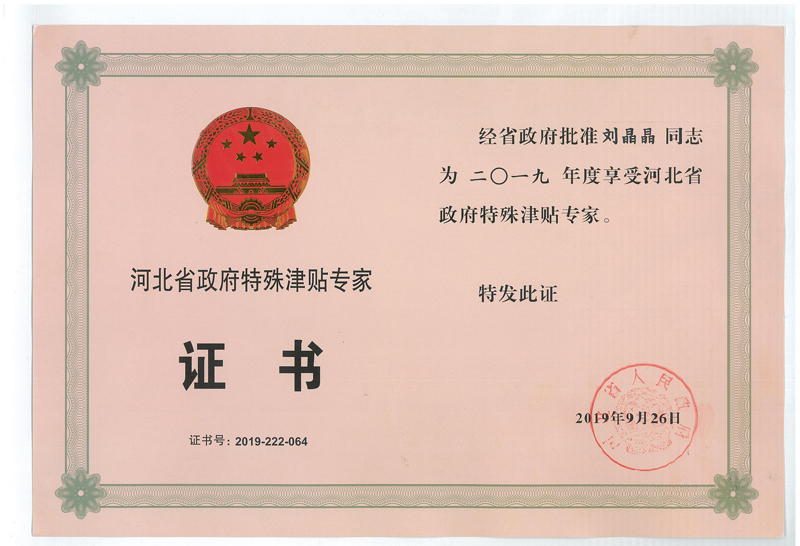經(jīng)公司組織申報(bào),石家莊市人民政府推薦,省人力資源和社會(huì)保障廳評(píng)審,省政府同意,公司劉晶晶同志榮獲省政府特殊津貼專家稱號(hào)。