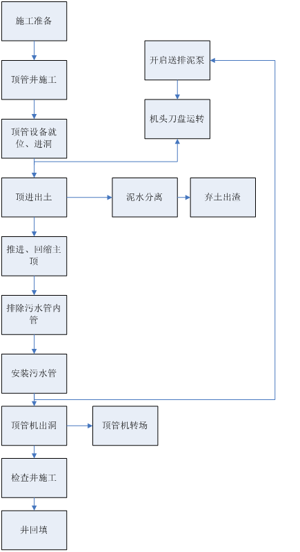 作為本次工程項(xiàng)目運(yùn)用泥水平衡頂管機(jī)的施工技術(shù)工藝流程圖,前期準(zhǔn)備、工作井、接收井施工、設(shè)備就位、安裝止水膠圈、進(jìn)洞、頂進(jìn)出土、分離泥水、回縮主頂、安裝頂管、頂管機(jī)出洞轉(zhuǎn)場(chǎng),進(jìn)行檢查井施工后回填。