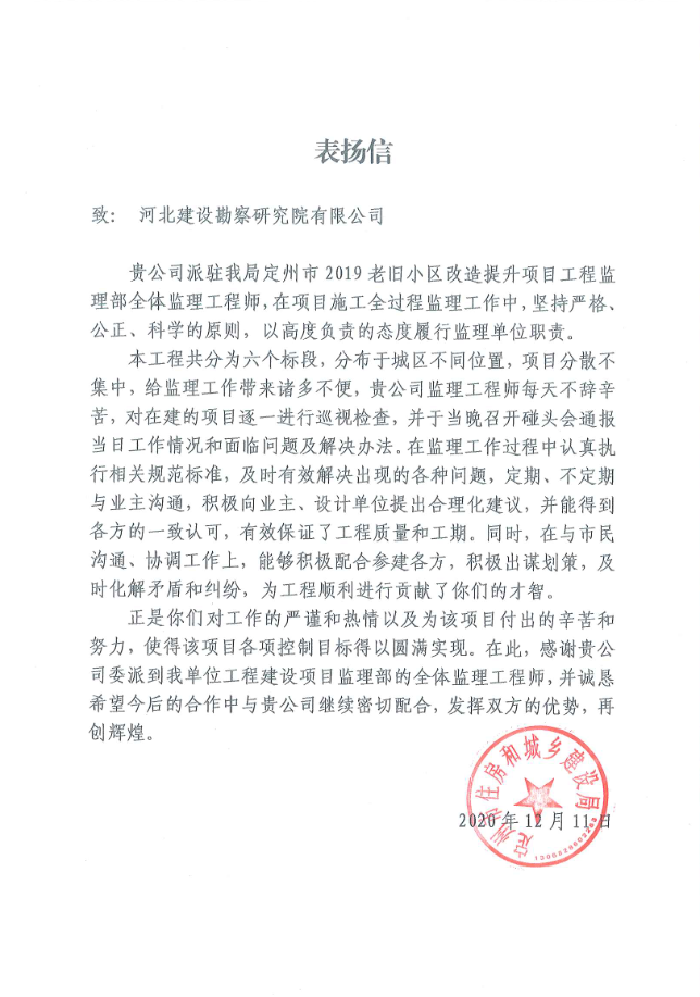 2020年12月我公司收到來(lái)自定州市住房和城鄉(xiāng)建設(shè)局關(guān)于定州市2019老舊小區(qū)改造提升項(xiàng)目監(jiān)理工程的表?yè)P(yáng)信,目前該項(xiàng)目已順利竣工驗(yàn)收。雖然該項(xiàng)目要求時(shí)間緊、任務(wù)重,但在監(jiān)理過(guò)程中我們公司嚴(yán)格按照相關(guān)規(guī)范、標(biāo)準(zhǔn),科學(xué)管理,嚴(yán)謹(jǐn)認(rèn)真負(fù)責(zé)的工作作風(fēng),保證了該項(xiàng)目按期完工,給各方留下了深刻的印象,不僅得到了定州市住房和城鄉(xiāng)建設(shè)局的高度認(rèn)可和贊譽(yù),還贏得了周邊市民的一致好評(píng),樹立了良好的口碑和信譽(yù),為躋身定州建筑市場(chǎng)更好擴(kuò)展業(yè)務(wù)奠定了基礎(chǔ)。