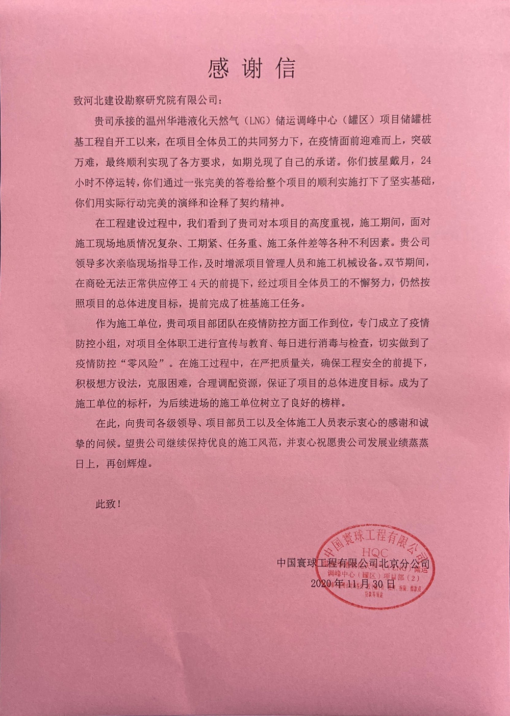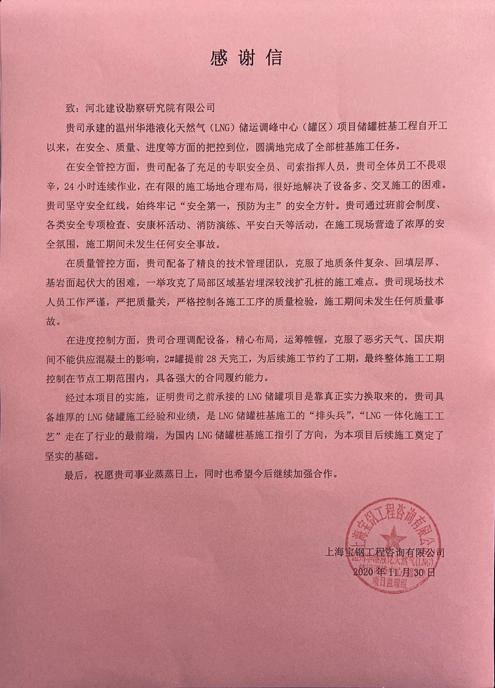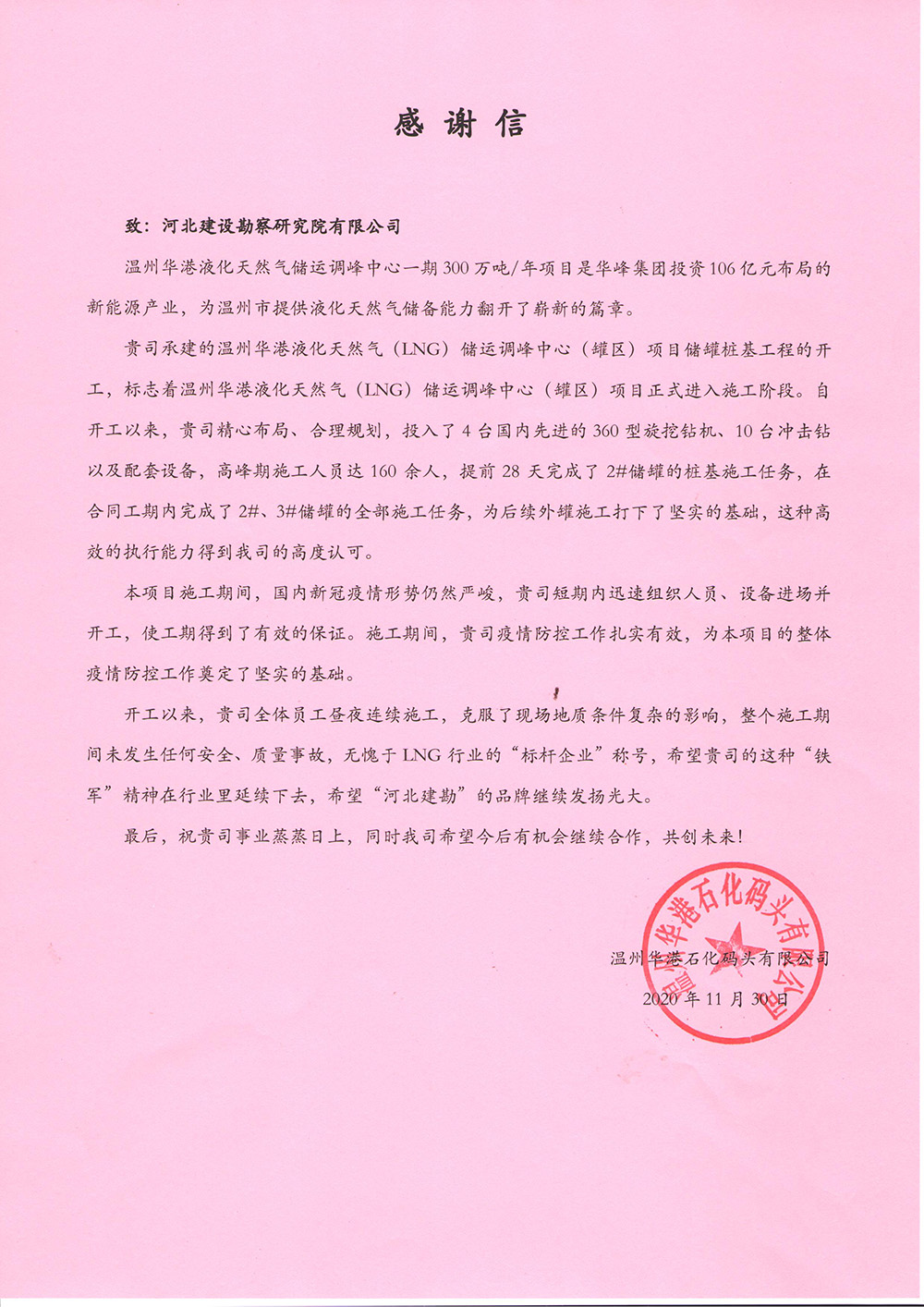 近日我公司溫州華港LNG項(xiàng)目部喜獲業(yè)主、總包、監(jiān)理的表揚(yáng)信,這是對項(xiàng)目部全體參建人員不畏艱難、頑強(qiáng)拼搏、攻堅(jiān)克難的施工精神的認(rèn)可和贊揚(yáng),更是對河北建勘高度的肯定。