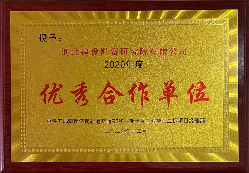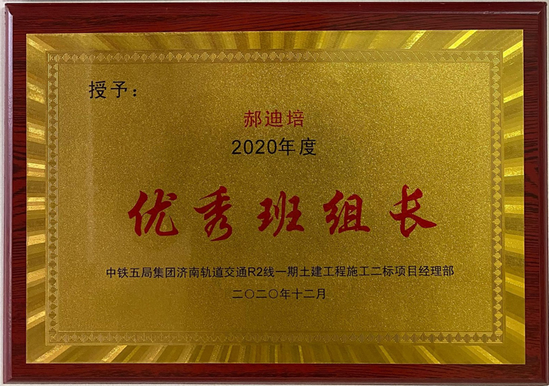 為此中鐵五局集團濟南軌道交通R2線一期工程項目土建二標經(jīng)理部特授予我公司“2020年度優(yōu)秀合作單位”和“郝迪培2020年度優(yōu)秀班組長” 兩項榮譽獎牌,希望我公司一如既往、繼續(xù)發(fā)揚優(yōu)良工作作風,并希望在今后的工作中,雙方精誠合作,共謀發(fā)展新篇章!