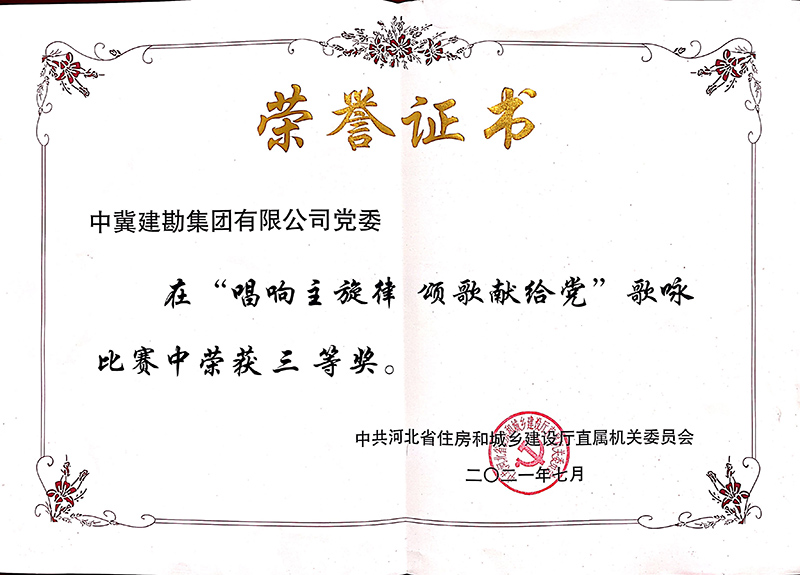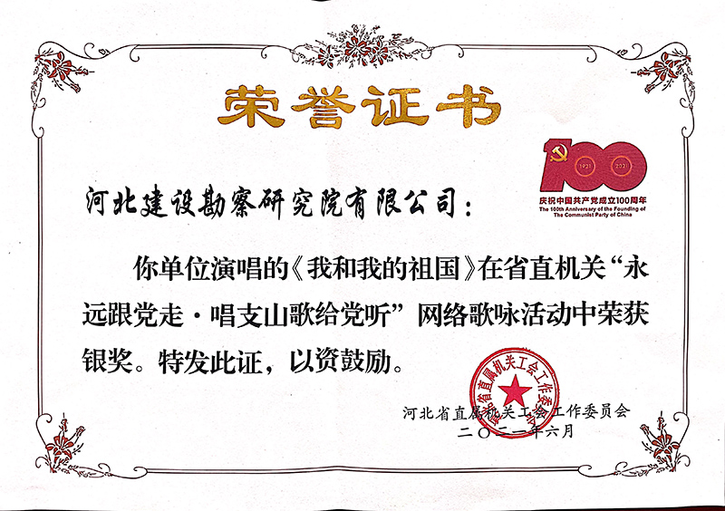 為慶祝中國共產(chǎn)黨建黨100周年,謳歌建黨百年的光輝歷程和豐功偉績,今年以來,公司開展了建黨百年系列慶祝活動,并積極響應(yīng)上級黨組織工作安排,先后參加了由省直工會組織開展的“永遠跟黨走•唱支山歌給黨聽”網(wǎng)絡(luò)歌詠活動和省住房和城鄉(xiāng)建設(shè)廳舉辦的“唱響主旋律 頌歌獻給黨”歌詠比賽,用嘹亮的歌聲和飽含深情的演唱充分展示了中冀建勘人積極向上的精神風貌,并在比賽中取得優(yōu)秀的成績。