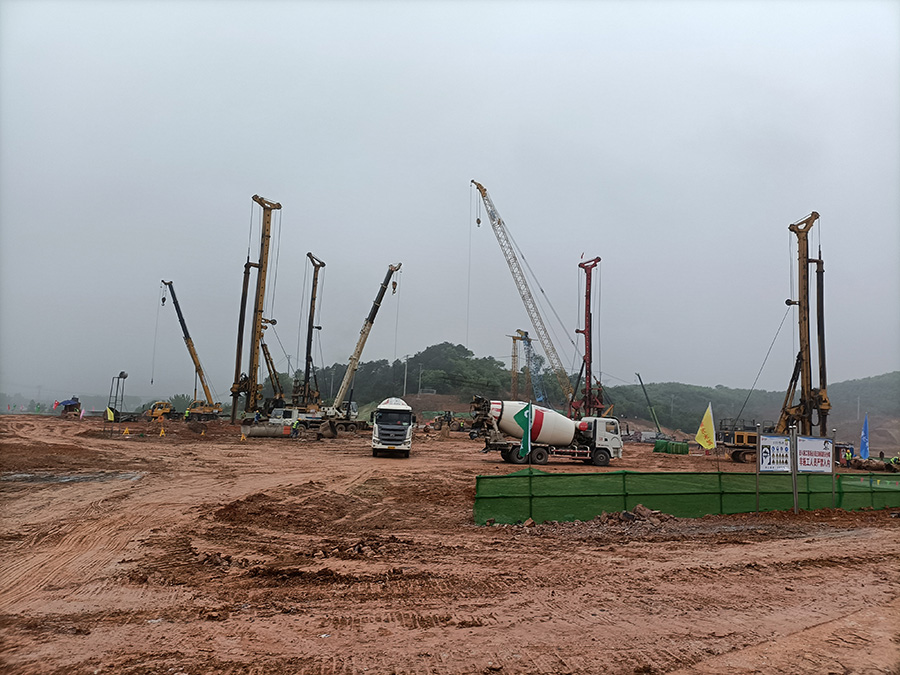 本工程樁基實際開工時間為2021年03月11日,竣工時間為2021年7月15日,共完成混凝土灌注量約12800m3,直徑800mm、樁長約13-26m鉆孔灌注樁183根,直徑1000mm、樁長約13~28.6m鉆孔灌注樁529根,直徑1400mm、樁長約18~25.5m鉆孔灌注樁54根,總計766根鉆孔灌注樁,強(qiáng)夯64917平米。經(jīng)抽樣檢驗297根樁基均達(dá)到合格等級,滿足驗收要求。單樁豎向抗壓試驗選取8根,鉆芯法取樣8根樁,淺層平板載荷試驗選取15點,承載力及強(qiáng)度均滿足設(shè)計要求。