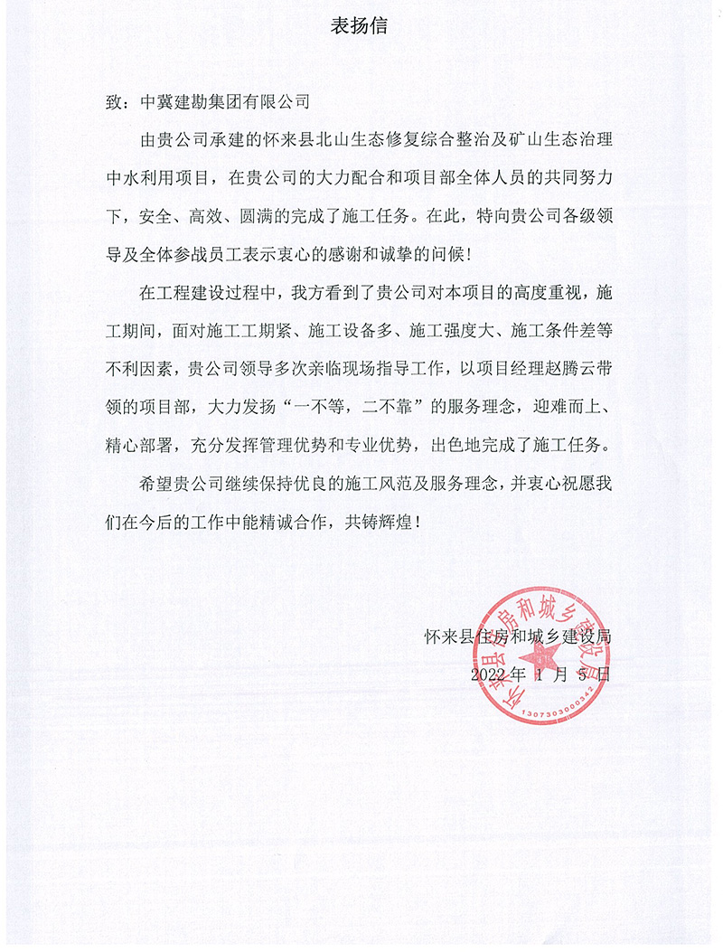 懷來(lái)縣北山生態(tài)修復(fù)綜合整治及礦山生態(tài)治理中水利用項(xiàng)目克服施工工期緊、施工設(shè)備多、施工強(qiáng)度大、施工條件差等不利因素,大力發(fā)揚(yáng)“一不等,二不靠”作風(fēng),迎難而上、精心部署,出色的完成了施工任務(wù),受到甲方領(lǐng)導(dǎo)的一致好評(píng)。