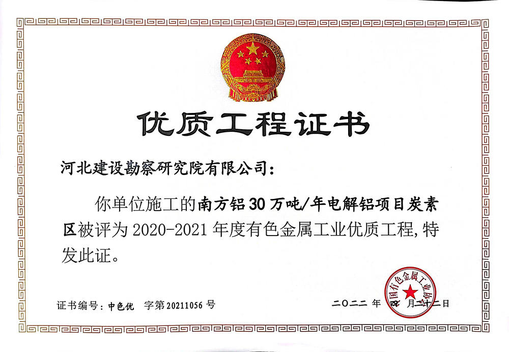 由我單位施工的南方鋁30萬噸/年電解鋁項(xiàng)目碳素區(qū)被評(píng)為2020—2021年度有色金屬工業(yè)優(yōu)質(zhì)工程獎(jiǎng)。