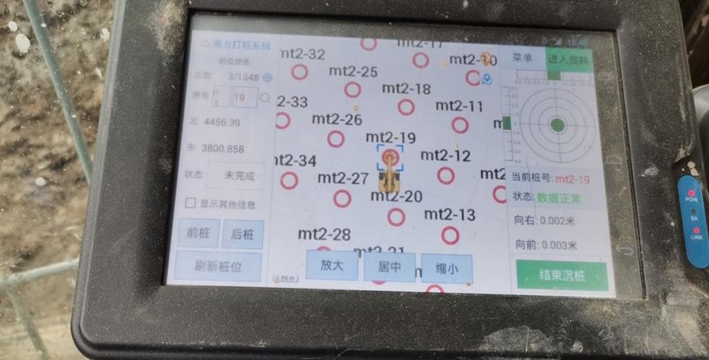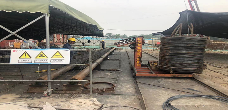 本工程自2021年2月21日開(kāi)工,2022年3月21日完工,總歷時(shí)375天。2021年5月進(jìn)入施工高峰期,使用旋挖鉆機(jī)9臺(tái),每日完成樁數(shù)約 70根。由于測(cè)放樁位的工作量大,采用全站儀測(cè)放效率較低,影響施工進(jìn)度,經(jīng)研究引進(jìn)了智能打樁系統(tǒng)。在引進(jìn)智能打樁系統(tǒng)后,先與全站儀測(cè)放的樁位進(jìn)行對(duì)比測(cè)試,對(duì)其測(cè)放樁位的精度和效率進(jìn)行了驗(yàn)證,滿足精度要求,并在項(xiàng)目實(shí)施過(guò)程中及時(shí)總結(jié)使用經(jīng)驗(yàn),為進(jìn)一步推廣智能化打樁系統(tǒng)的應(yīng)用打好基礎(chǔ)。本工程在鋼筋籠制作方面,采用了3臺(tái)滾籠機(jī)進(jìn)行箍筋纏繞工作,提高了工作效率并減少了人員投入,保證了施工進(jìn)度需要。