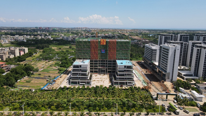 海南辦公樓占地面積15畝,地下二層,地上12層,總建筑面積47527平方米。工程自2021年9月13日現(xiàn)場(chǎng)舉辦開工儀式以來,經(jīng)過11個(gè)月的合力攻堅(jiān),克服高溫、臺(tái)風(fēng)、疫情等重重難關(guān),如期實(shí)現(xiàn)了一個(gè)個(gè)關(guān)鍵節(jié)點(diǎn):2021年10月25日第一根基礎(chǔ)工程樁混凝土灌注順利完成;2021年12月4日開始8萬方土方開挖的任務(wù);2022年1月29日,實(shí)現(xiàn)了基礎(chǔ)筏板的澆筑;2022年4月10日,完成了地下二層車庫(kù)施工,主體如期“沖”出正負(fù)零;2022年6月24日,東、西配樓主體按計(jì)劃日期封頂。如今項(xiàng)目迎來了主體封頂?shù)睦锍瘫瑸楹笃诠こ虡淞⒘藰?biāo)桿!
