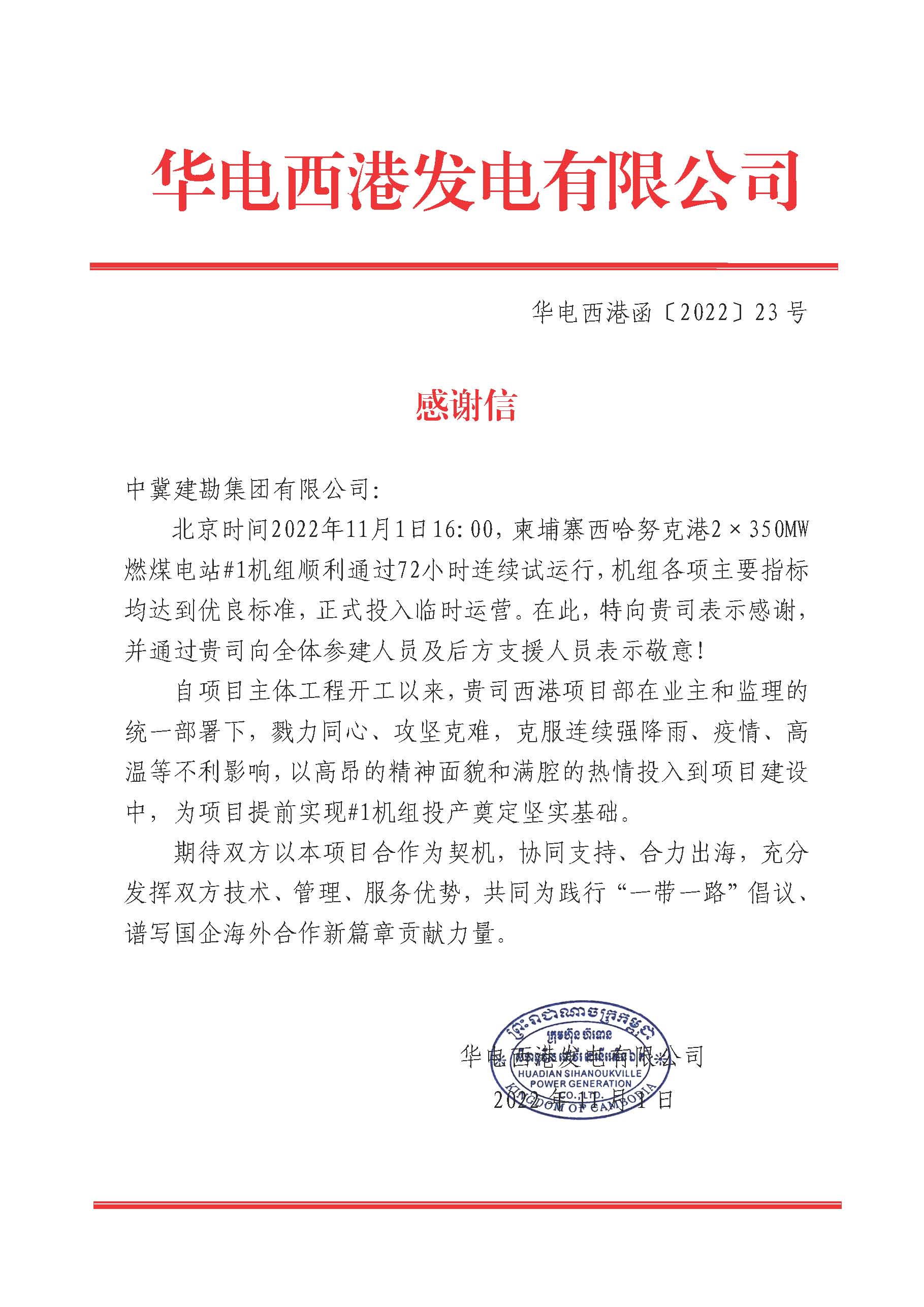 北京時間2022年11月1日16:00,由我公司承建的柬埔寨西哈努克港2×350MW燃煤電站#1機(jī)組順利通過柬埔寨國家電力公司要求的滿負(fù)荷性能試驗(yàn),標(biāo)志著中國華電在柬投資興建的最大火電項(xiàng)目首臺機(jī)組正式投產(chǎn)發(fā)電。該項(xiàng)目是中國華電在“一帶一路”沿線國家投資建設(shè)的重點(diǎn)工程,也是目前中國在柬單體投資最大電源項(xiàng)目。業(yè)主華電西港發(fā)電有限公司特向我公司表示感謝,并對我公司全體參建人員及后方支持人員表示敬意!