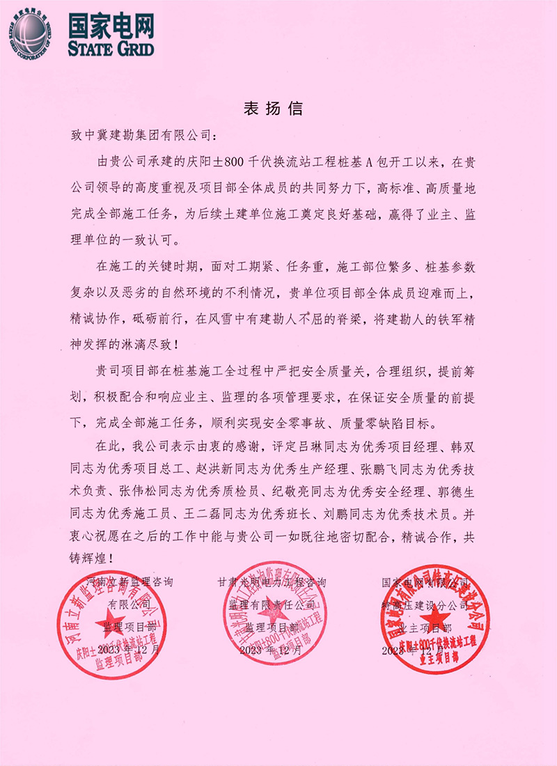 公司收到了國家電網(wǎng)慶陽±800千伏換流站工程由業(yè)主國家電網(wǎng)和監(jiān)理單位河南立新及甘肅光明的聯(lián)合表揚(yáng)信,表揚(yáng)信中說在我公司領(lǐng)導(dǎo)的高度重視及項(xiàng)目部全體成員的共同努力下,高標(biāo)準(zhǔn)、高質(zhì)量地完成施工任務(wù),為后續(xù)土建單位施工奠定良好基礎(chǔ),贏得了業(yè)主、監(jiān)理單位的一致認(rèn)可。在施工的關(guān)鍵時(shí)期,我單位項(xiàng)目部全體成員迎難而上,精誠協(xié)作,砥礪前行,在風(fēng)雪中有建勘人不屈的脊梁,將建勘人的鐵軍精神發(fā)揮的淋漓盡致!