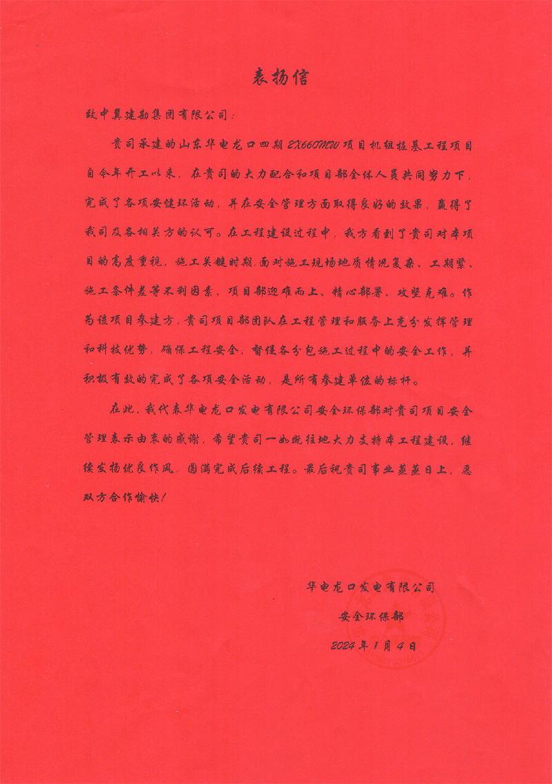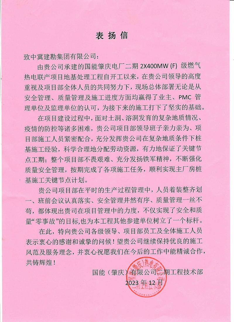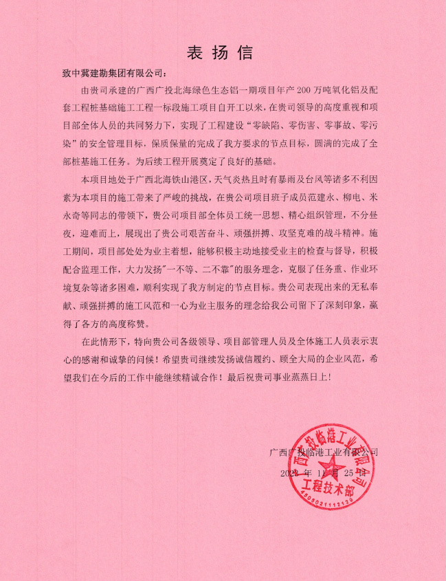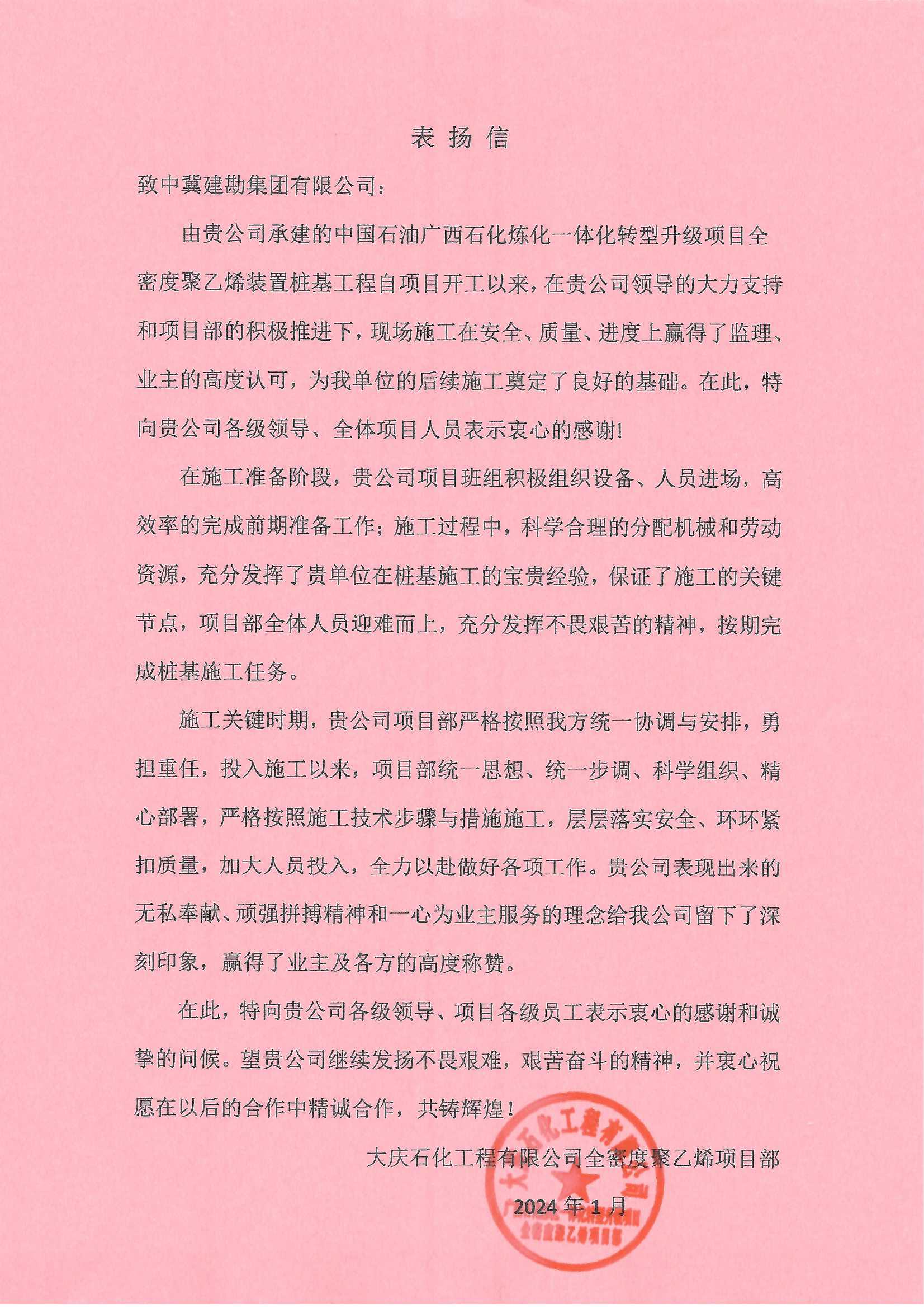 廣西石化煉化項(xiàng)目部接收到大慶石化工程有限公司全密度聚乙烯工程建設(shè)部項(xiàng)目經(jīng)理牛家偉發(fā)來的表揚(yáng)信,信中肯定了我項(xiàng)目部在廣西石化煉化項(xiàng)目樁基工程中所取得的成果。