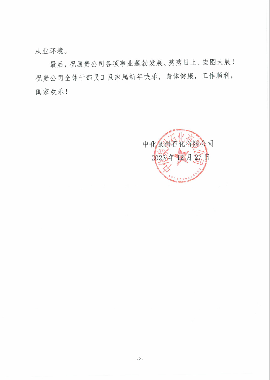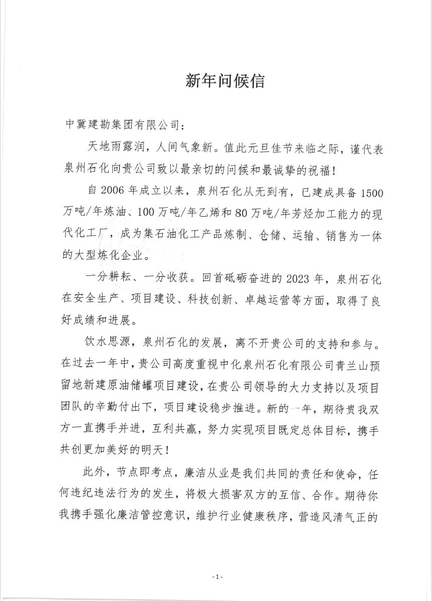 中化泉州石化有限公司為我公司發(fā)來了新年問候信,信中中化泉州石化有限公司肯定了我公司對中化泉州石化有限公司青蘭山預(yù)留地新建原油儲罐項(xiàng)目建設(shè)的重視;看到了我公司及項(xiàng)目施工人員為項(xiàng)目的辛勤付出;并期望在新的一年里加強(qiáng)合作,再創(chuàng)新業(yè)績。