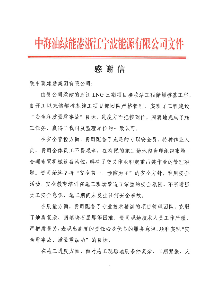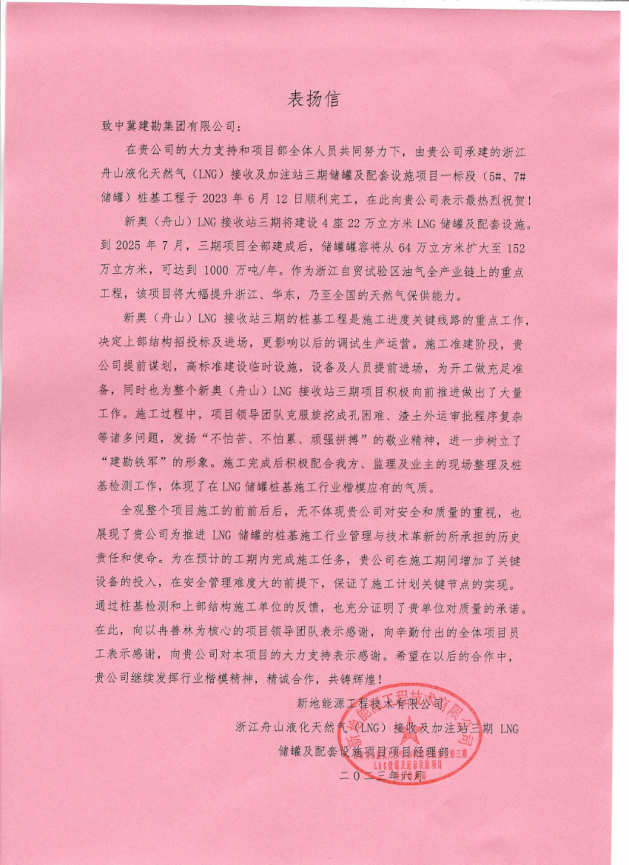 浙江舟山液化天然氣(LNG)接收及加注站三期LNG儲罐及配套設(shè)施項(xiàng)目(5#、7#儲罐樁基工程)于2023年6月25日收到新地能源工程技術(shù)有限公司發(fā)來的表揚(yáng)信。自開工以來,在公司的大力支持和項(xiàng)目部全體員工的共同努力下,精心組織、全力布局,克服了前期施工任務(wù)重等諸多困難,安全、高效、優(yōu)質(zhì)的完成了儲罐的樁基施工任務(wù),有力保障了本項(xiàng)目總體工期計(jì)劃,贏得了監(jiān)理單位和業(yè)主單位的一致認(rèn)可和好評。
