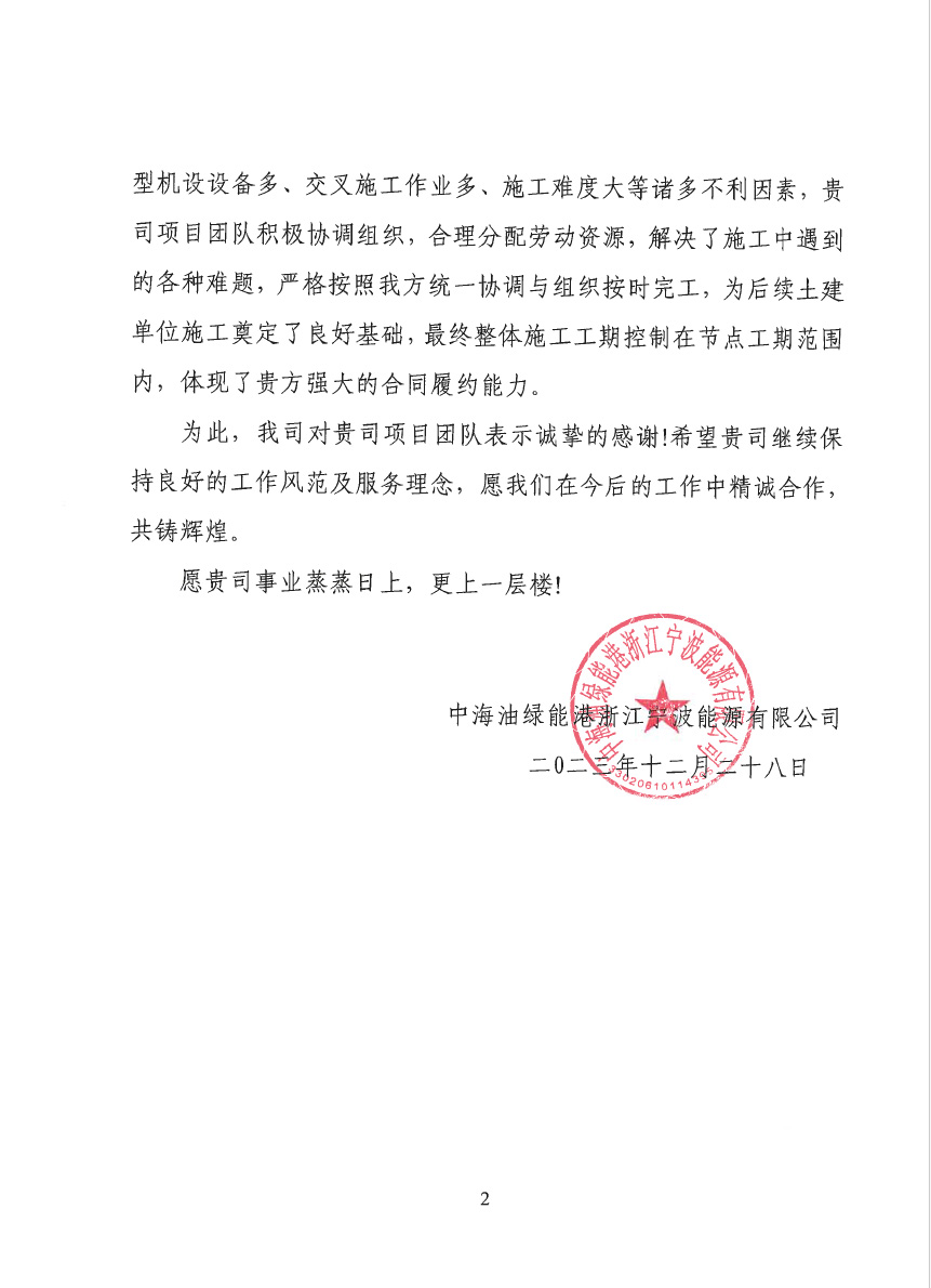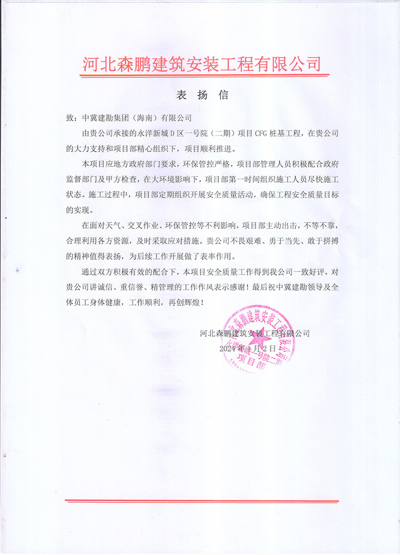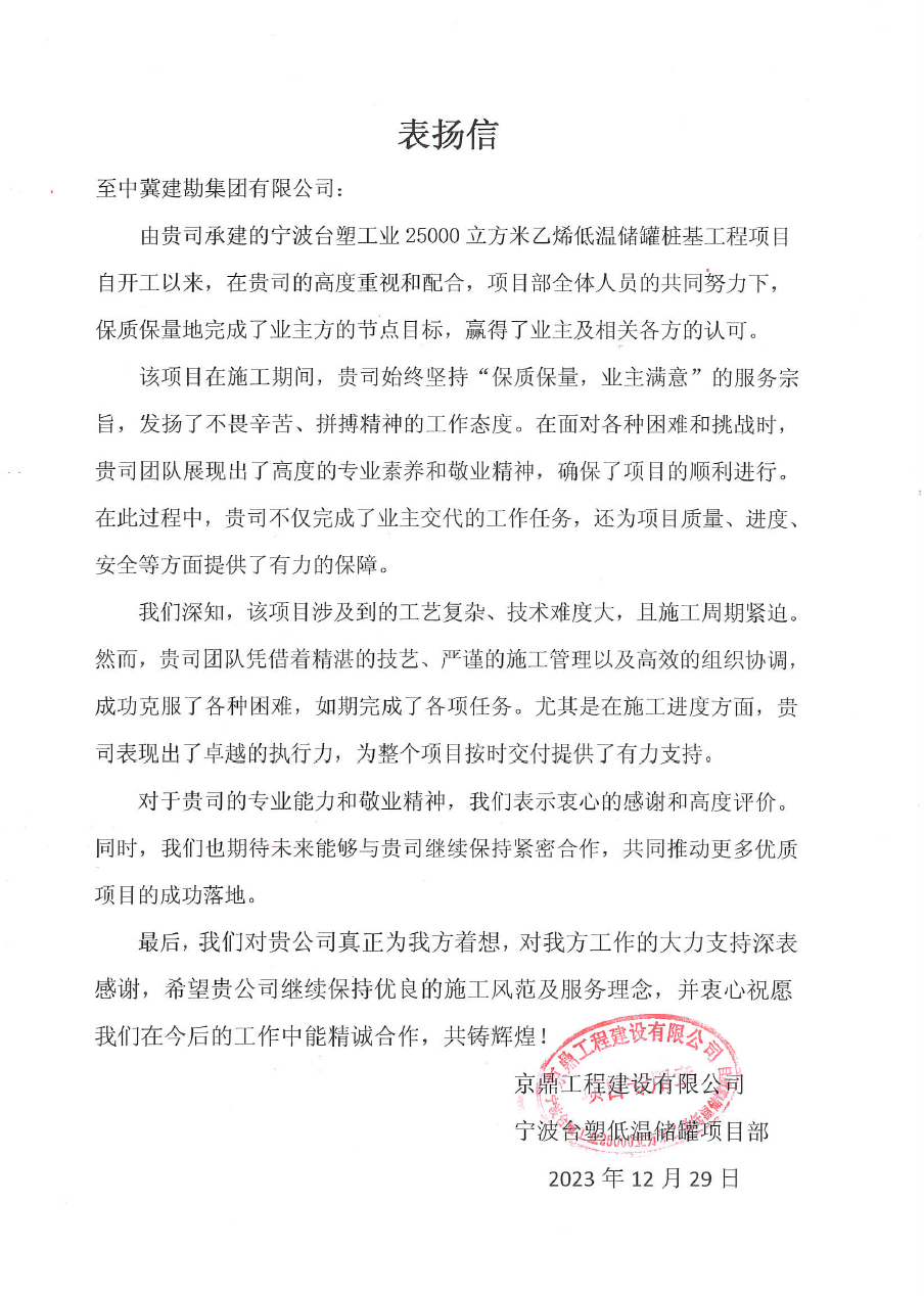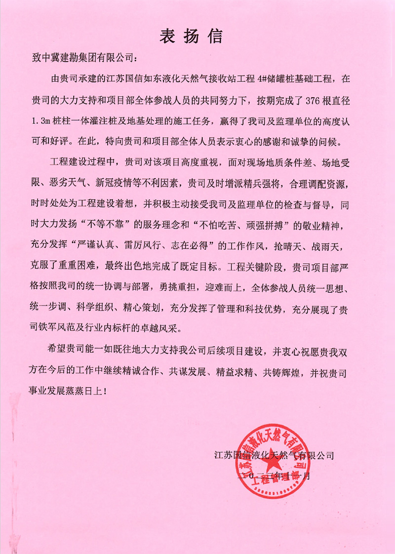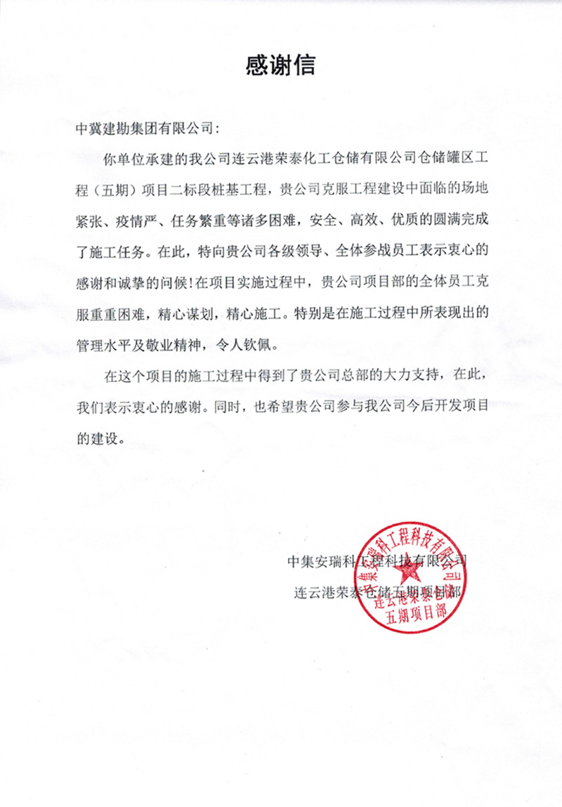 連云港榮泰化工倉儲有限公司倉儲罐區(qū)工程(五期)項(xiàng)目二標(biāo)段樁基工程,業(yè)主在表揚(yáng)信中說:貴公司克服工程建設(shè)中面臨的場地緊張、疫情嚴(yán)、任務(wù)繁重等諸多困難,安全、高效、優(yōu)質(zhì)的圓滿完成了施工任務(wù)。貴公司項(xiàng)目部全體員工克服重重困難,精心謀劃,精心施工。特別是在施工中所表現(xiàn)出的管理水平及敬業(yè)精神,令人欽佩。