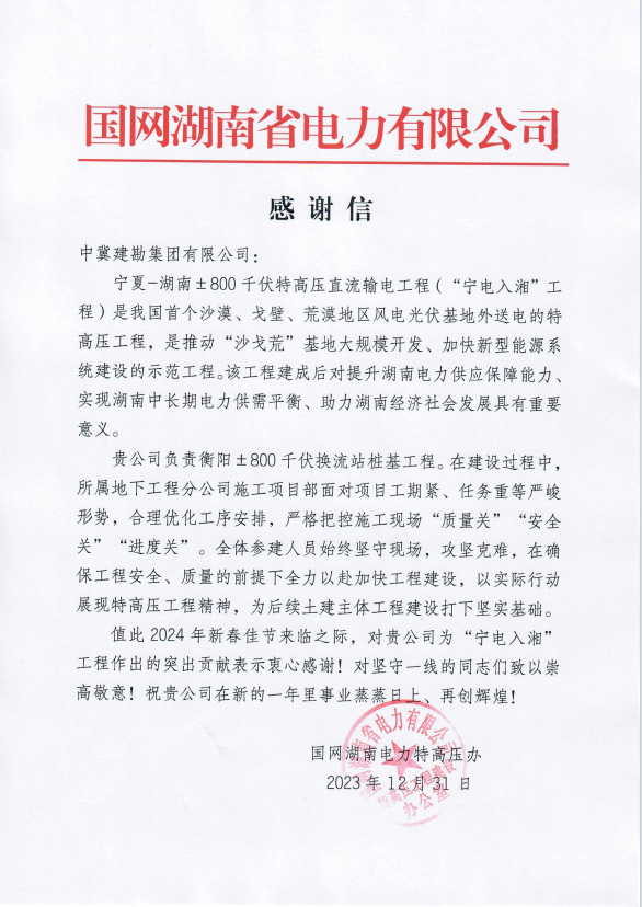 國家電網(wǎng)湖南電力特高壓辦,為我公司承建的衡陽±800千伏換流站工程樁基項(xiàng)目部發(fā)來感謝信一封。感謝信內(nèi)容主要表達(dá)了,面對項(xiàng)目的工期緊,任務(wù)重等關(guān)鍵形勢,稱贊我公司能嚴(yán)格把質(zhì)量關(guān),安全關(guān)和進(jìn)度關(guān)。