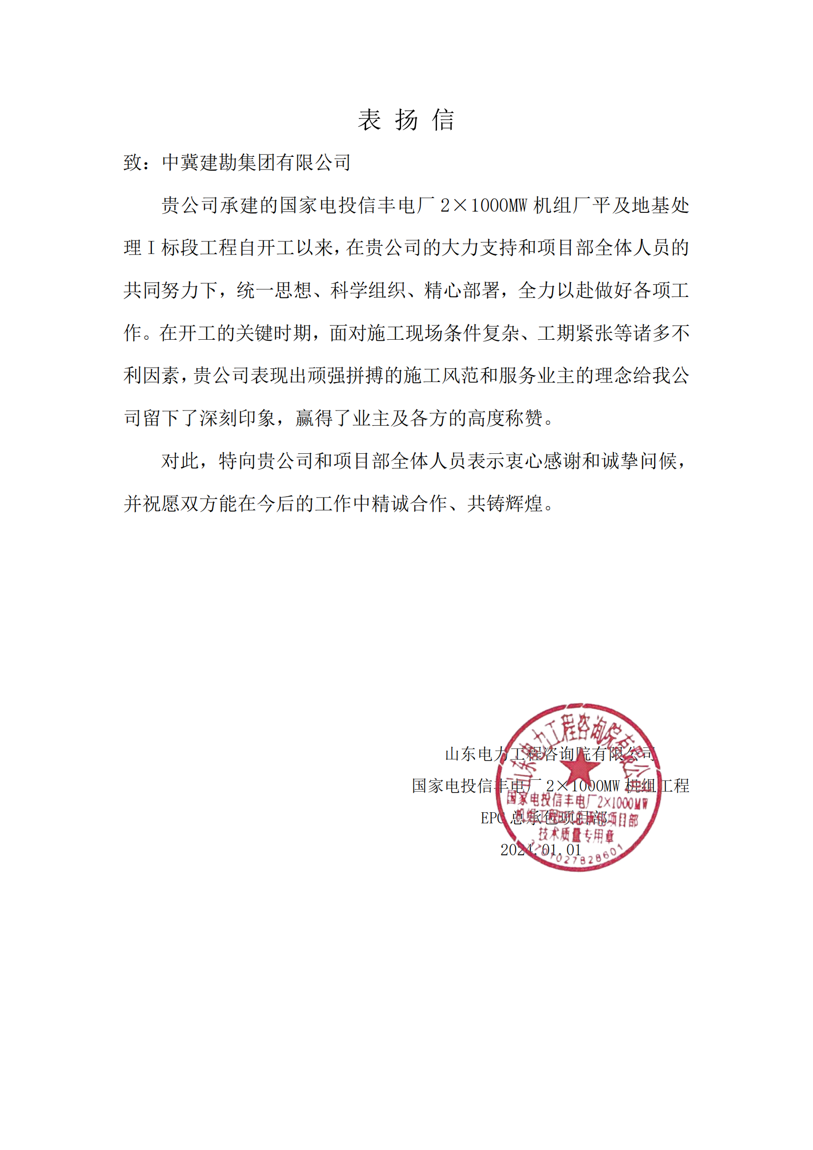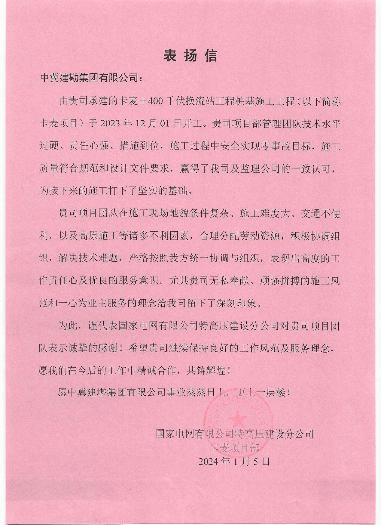 卡麥±400千伏換流站工程樁基施工工程收到業(yè)主國家電網(wǎng)有限公司特高壓建設(shè)分公司發(fā)來的表揚(yáng)信。項(xiàng)目部敢打硬仗的精神面貌,贏得了業(yè)主方的高度贊賞和認(rèn)可。