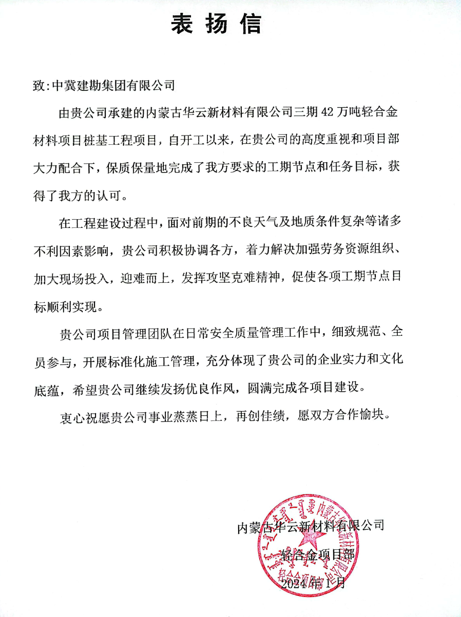 內(nèi)蒙古華云新材料有限公司三期42萬噸輕合金材料項(xiàng)目樁基工程,在工程建設(shè)過程中,面對前期的不良天氣及地質(zhì)條件復(fù)雜等諸多不利因素影響,積極協(xié)調(diào)各方,著力解決加強(qiáng)勞務(wù)資源組織、加大現(xiàn)場投入,迎難而上,發(fā)揮攻堅(jiān)克難精神,保質(zhì)保量地完成了工期節(jié)點(diǎn)和任務(wù)目標(biāo),獲得甲方的認(rèn)可。