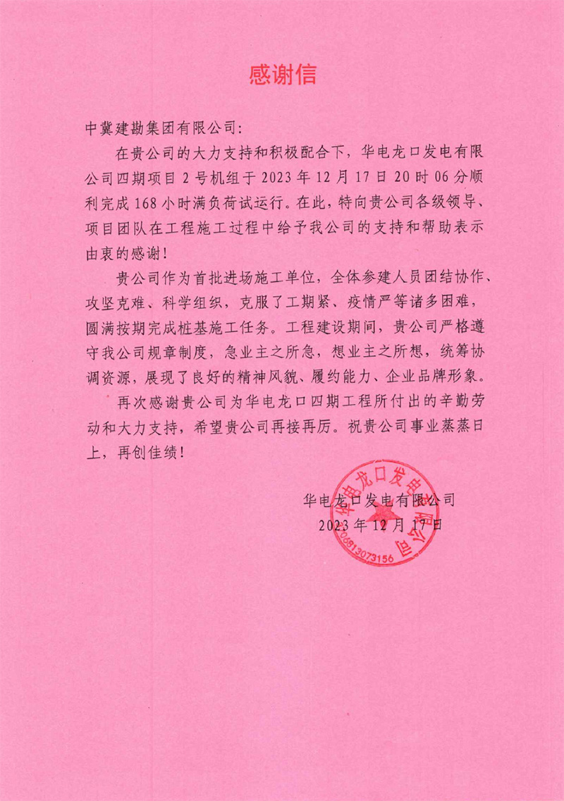 華電龍口發(fā)電有限公司四期項(xiàng)目2號機(jī)組于2023年12月17日20時(shí)04分順利完成168小時(shí)滿負(fù)荷試運(yùn)行。工程建設(shè)期間,完成了各項(xiàng)安健環(huán)活動,并在安全管理方面取得良好的效果,贏得了業(yè)主方認(rèn)可。我公司人員嚴(yán)格遵守我公司規(guī)章制度,急業(yè)主之所急,想業(yè)主之所想,統(tǒng)籌協(xié)調(diào)資源,展現(xiàn)了良好的精神風(fēng)貌、履約能力、企業(yè)品牌形象。為此,業(yè)主特向我公司各級領(lǐng)導(dǎo)、項(xiàng)目團(tuán)隊(duì)在工程施工過程中給予的支持和幫助表示由衷感謝。