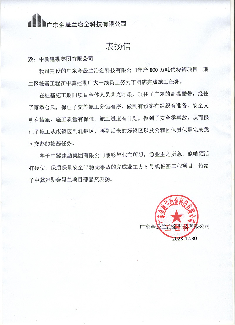 廣東金盛蘭冶金科技有限公司年產(chǎn)800萬噸優(yōu)特鋼項(xiàng)目二期二區(qū)樁基工程,在施工期間項(xiàng)目全體人員共克時(shí)艱,頂住了廣東的高溫酷暑,經(jīng)住了雨季臺風(fēng),保證了交差施工分錯有序,做到了預(yù)案有組織有準(zhǔn)備,安全文明有措施,施工質(zhì)量有保證,施工進(jìn)度有計(jì)劃,做到了安全零事故,保質(zhì)保量的完成任務(wù),業(yè)主對項(xiàng)目給予嘉獎表揚(yáng)。
