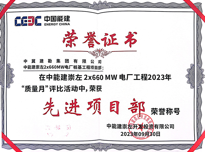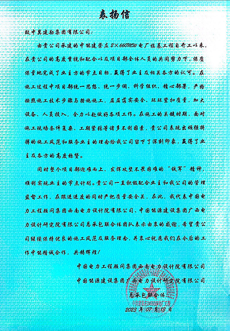中能建崇左2×660MW電廠樁基工程,在施工過程中,項(xiàng)目部統(tǒng)一思想、統(tǒng)一步調(diào)、科學(xué)組織,精心部署,嚴(yán)格按照施工技術(shù)步驟與措施施工,層層落實(shí)安全,環(huán)環(huán)緊扣質(zhì)量,加大設(shè)備、人員投入,全力以赴做好各項(xiàng)工作。全體員工以頑強(qiáng)拼搏的施工風(fēng)范和服務(wù)業(yè)主的理念給我公司留下了深刻印象,贏得了業(yè)主及各方的高度稱贊。