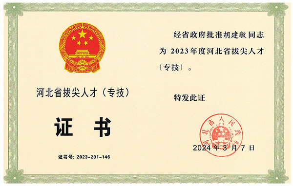 經(jīng)公司組織申報(bào),石家莊市鹿泉區(qū)人民政府、石家莊市人民政府推薦,河北省人力資源和社會(huì)保障廳組織評(píng)審、答辯,河北省人民政府批準(zhǔn),公司胡建敏同志榮獲2023年度河北省拔尖人才(專(zhuān)技)。