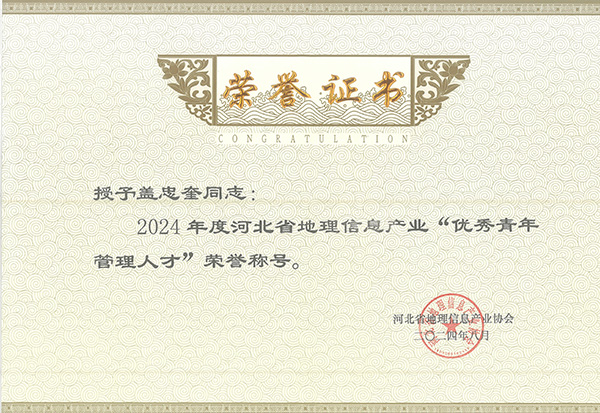 近期,由河北省地理信息產(chǎn)業(yè)協(xié)會(huì)評(píng)選,我公司被授予第五屆理事會(huì)“先進(jìn)工作單位”榮譽(yù)稱號(hào)和2022-2023年度河北省地理信息產(chǎn)業(yè)“十佳單位”榮譽(yù)稱號(hào),蓋忠奎同志榮獲2024年度河北省地理信息產(chǎn)業(yè)“優(yōu)秀青年管理人才”稱號(hào)。