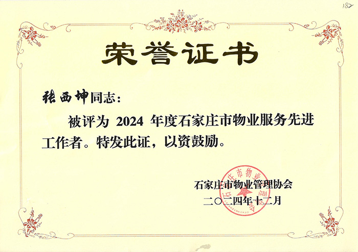 中冀建勘物業(yè)服務(wù)有限公司榮獲“2024年度石家莊市物業(yè)管理先進(jìn)單位”,張西坤同志榮獲“物業(yè)服務(wù)先進(jìn)工作者” 榮譽(yù)稱(chēng)號(hào)。