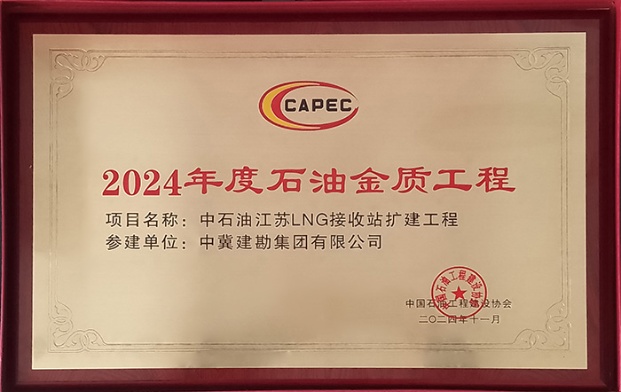 近日,集團(tuán)公司收到中國石油工程建設(shè)協(xié)會頒發(fā)的獎牌,由二公司參建的中石油江蘇LNG接收站擴(kuò)建工程項(xiàng)目喜獲“2024年度石油金質(zhì)工程”。