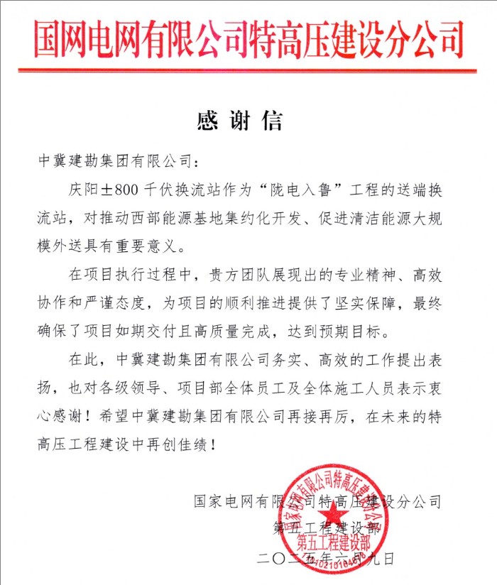 2025年6月9日,在±800千伏隴東-山東特高壓直流工程(簡稱“隴電入魯”)正式投運之際,我公司收到國家電網(wǎng)有限公司特高壓建設(shè)分公司對慶陽±800千伏換流站項目發(fā)來的感謝信。信中高度贊揚(yáng)了我公司在項目執(zhí)行過程中展現(xiàn)出的卓越專業(yè)精神、高效協(xié)作能力和嚴(yán)謹(jǐn)工作態(tài)度。