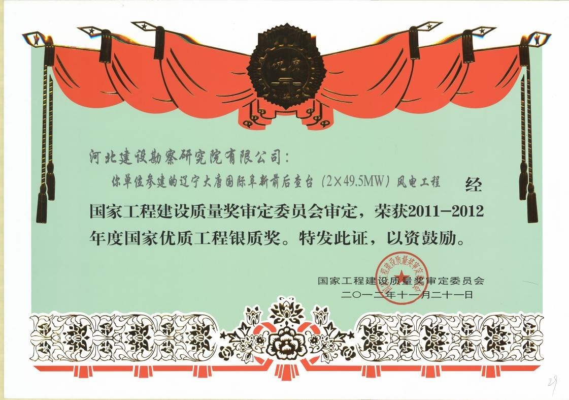 由我公司參與施工的遼寧大唐國際阜新前后查臺(2×49.5MW)風電工程被國家工程建設質(zhì)量獎評定委員會評定為2011-2012年度“國家優(yōu)質(zhì)工程銀質(zhì)獎”。