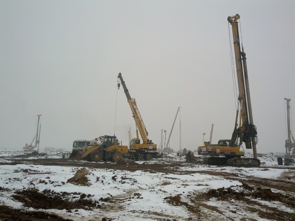 本工程采用Ф800㎜、Ф600㎜后壓漿旋挖鉆孔灌注樁、Ф600㎜旋挖鉆孔灌注樁進(jìn)行地基處理。主要工作范圍為:施工區(qū)域?yàn)橹鲝S房A排外道路以西、鍋爐和電袋復(fù)合除塵器之間道路以東、主廠房固定端道路以北、擴(kuò)建端道路以南區(qū)域之間的的全部構(gòu)(建)筑物的樁基工程施工,包括汽機(jī)房框架、汽機(jī)基座、煤倉間、鍋爐爐架、電梯井、加熱器平臺(tái)、換熱站及熱網(wǎng)支架、輔助設(shè)備基礎(chǔ)、綜合生產(chǎn)服務(wù)樓、主變區(qū)域、渣倉基礎(chǔ)、爐后設(shè)備基礎(chǔ)等建筑物及設(shè)備基礎(chǔ)的樁基施工。主要工作內(nèi)容包括:測(cè)量放線、旋挖成孔、鋼筋籠制作、砼灌注成樁、后壓漿等。