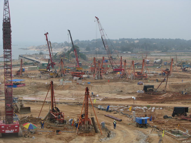 粵東液化天然氣項(xiàng)目由中海油投資建設(shè),CB&I歐洲工程公司承攬三個(gè)儲罐的設(shè)計(jì)、施工、采購工作,受美國CB&I歐洲工程公司委托,我公司承接了三個(gè)罐區(qū)回填砂工作、樁基工程施工和檢測。自2013年3月7日開始施工,至2013年11月7日竣工,總計(jì)完成回填砂工作量約為7.2萬m3,混凝土灌注樁1074根。