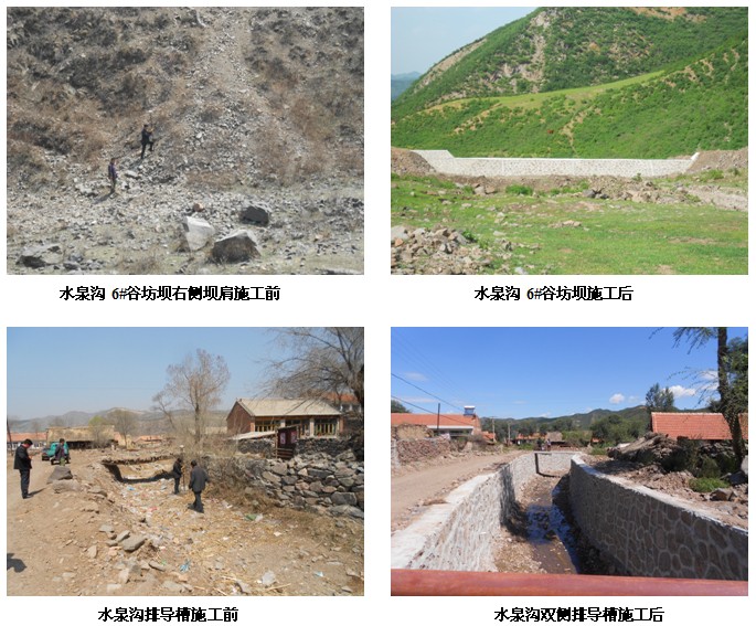 本治理工程施工時間為2013年5月8日-2013年9月10日,包括水泉村范圍內(nèi)水泉溝、王小溝兩條溝谷,主要施工項目為谷坊壩、排導(dǎo)槽、擋墻工程,其中水泉溝內(nèi)包括6道谷坊壩,PM2坡面護腳擋墻,水泉溝單側(cè)排導(dǎo)槽(0~249.3m),水泉溝雙側(cè)排導(dǎo)槽(0~708.6m),王小溝內(nèi)包括道谷坊壩7道,王小溝單側(cè)排導(dǎo)槽(0~271.2m),王小溝雙側(cè)排導(dǎo)槽(0~372m)。